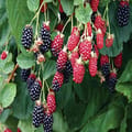 🍇 Long arching canes with thorns (thornless varieties available) bearing large, firm black berries in summer