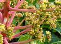 • Flowers: The tree produces "panicles"—long, branched clusters at the tips of branches—carrying hundreds of tiny, fragrant white-to-pinkish flowers.